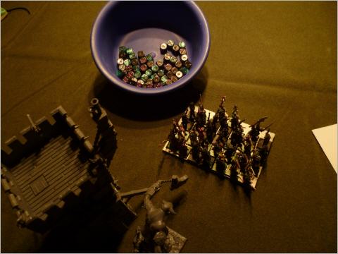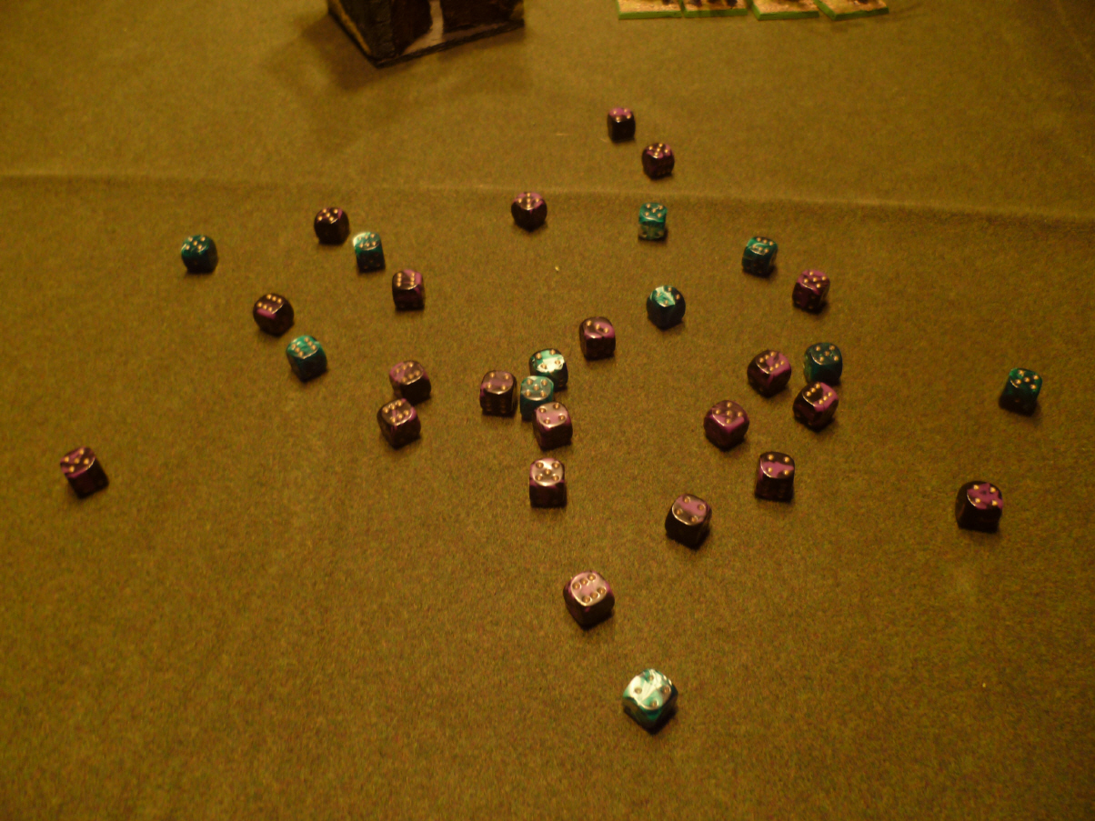 Und nun kam das absolute Highlight des gesamten Spiels. Jedes Modell konnte schießen (großes Ziel) und das mit Doppelschuß. Das waren 56 Schuß der Korsaren und 4 der Adligen. Wir klaubten alle Würfel zusammen, die wir hatten. Die kamen alle in eine Küchenschüssel und Daniel legte seine beiden Schüsselwürfe hin… Der Burner schlechthin, was haben wir gelacht und gefeixt.