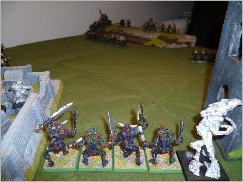Der Magier bringt noch mal die Finsternis der Verzweiflung auf den Echsenstreitwagen durch. Der wird dann auch in die Flucht geschlagen und verlässt das Spielfeld. Die Speerschleuder war dann nur noch pro forma.
