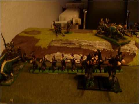 Gegenüber meiner linken Flanke befand sich ein Hügel in Daniels Aufstellungszone. Der wurde sogleich mit 2 Repetier-Speerschleudern und 2 Echsenstreitwagen bemannt. Davor und daneben positionierten sich 2 Einheiten Armbrustschützen. Den Rest seiner Armee, eine große Einheit Korsaren mit Adligem und Armeestandartenträger stellte er ganz weit außen gegenüber meiner rechten Flanke auf. Dort kundschaftete auch noch eine Einheit Schatten hin.