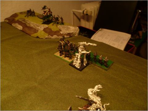 In der dritten Runde kam ich endlich an und die Drachenoger prallten in eine Einheit Armbrustschützen. Vier Elfen wurden geschlagen und der Rest floh danach über den Hügel von der Platte. Die Drachenoger nahmen den dahinter stehenden Echsenwagen in der Flanke. Panik wird überall souverän gestanden. Selbst der zweite Echsenwagen vor den Hunden stand bravourös und das obwohl die Finsternis der Verzweiflung auf ihm lag.