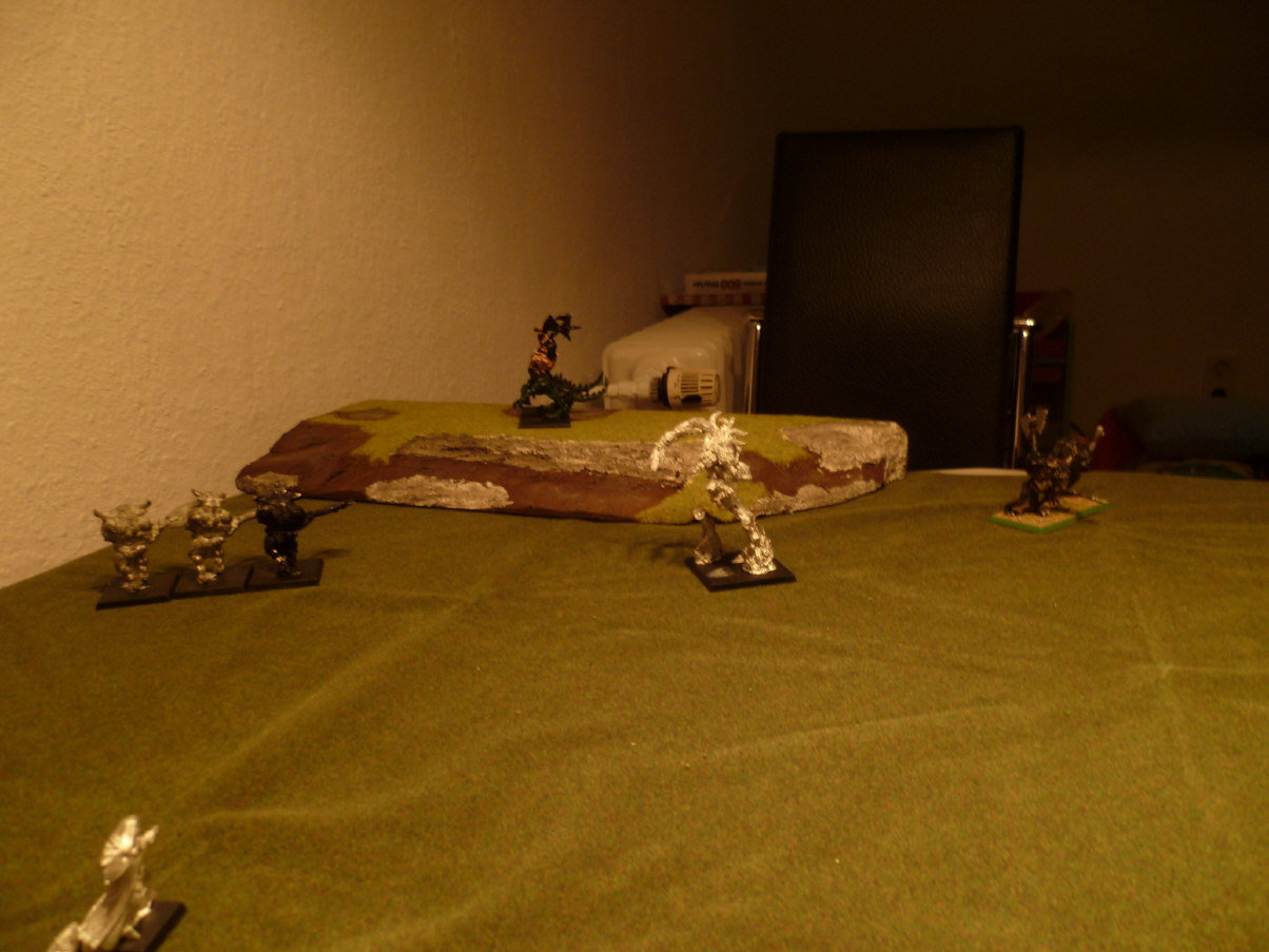 Daniels erster Wurf patzte und ich durfte beginnen. Alles rückte vor, wobei die Trolle aber nach links Richtung Hügel einschwenkten. Der Magier bekam nix durch und hey Schussphase entfällt. Schon war Daniel dran.
