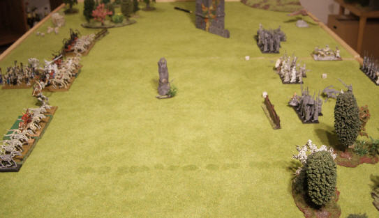 Die Elfen bereiteten sich auf den Angriff der Streitwagen vor und stellten sich für Konterangriffe bereit. Die entfesselten magischen Energien schalteten einige leichte Kavalleristen aus. Der Beschuss kostete die Streitwagen der einen Prinzeneinheit das untote Leben.